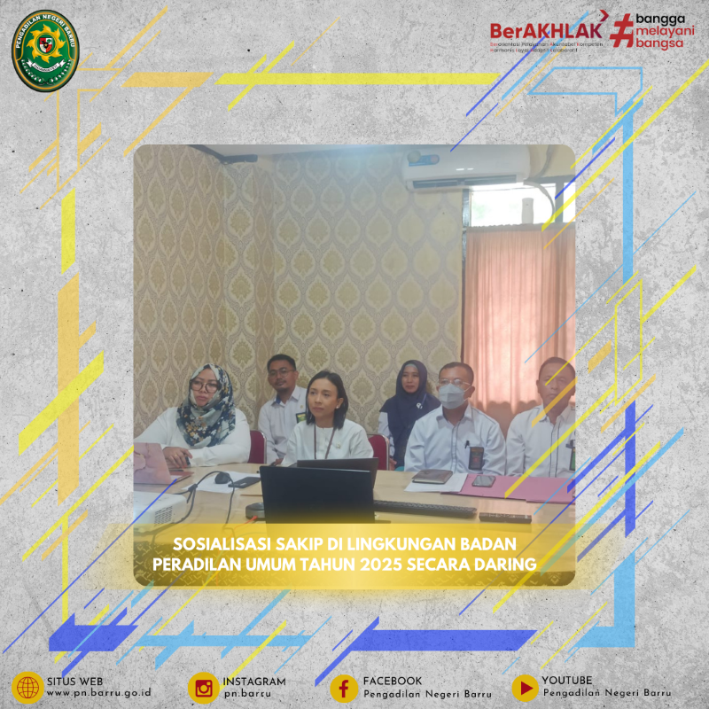 Pada hari Senin, tanggal 24 Februari 2025, bertempat di Ruang Media Center Pengadilan Negeri Barru, Ketua dan Wakil Ketua Pengadilan Negeri Barru, Hakim, Panitera, Sekretaris, dan Kepala Sub Bagian Perencanaan, Teknologi Informasi, dan Pelaporan mengikuti Sosialisasi Penyusunan Sistem Akuntabilitas Kinerja Instansi Pemerintah (SAKIP) di Lingkungan Badan Peradilan Umum Tahun 2025 secara daring via zoom.