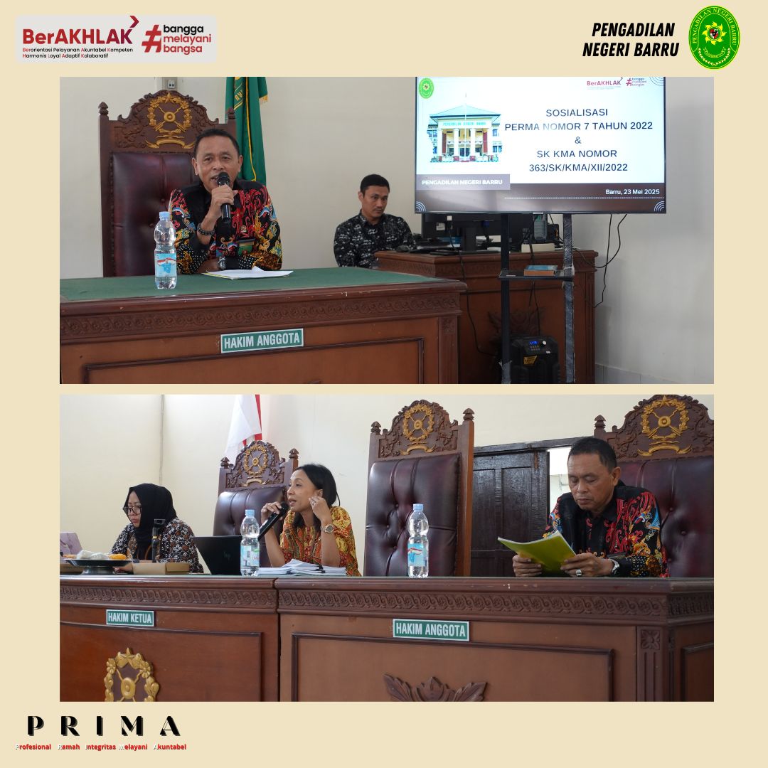 Pada hari Jumat, tanggal 23 Mei 2025, bertempat di Ruang Sidang Cakra Pengadilan Negeri Barru, Pimpinan serta Hakim dan segenap aparatur Pengadilan Negeri Barru mengikuti Sosialisasi PERMA Nomor 7 Tahun 2022 & SK KMA Nomor 363/SK/KMA/XII/2022. Turut hadir para undangan dari Aparat Penegak Hukum (APH), yakni dari Jaksa Penuntut Umum Kejaksaaan Negeri Barru bersama jajarannya, Posbakum Pengadilan Negeri Barru, serta dari Penasihat Hukum.