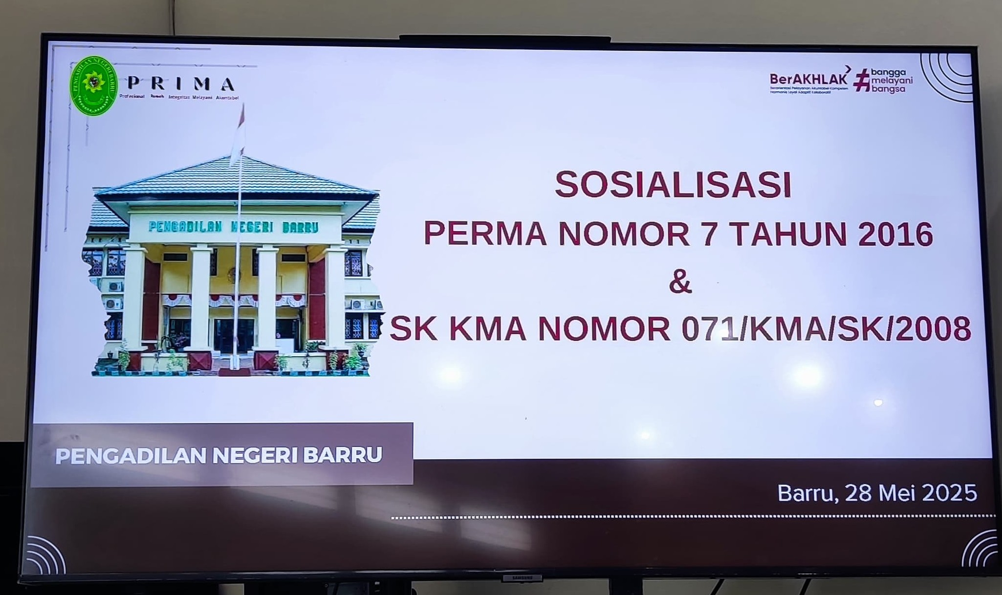 Pada hari Selasa tanggal 28 Mei 2025, bertempat di Ruang Sidang Cakra Pengadilan Negeri Barru, Pimpinan, Hakim, serta segenap aparatur Pengadilan Negeri Barru mengikuti Sosialisasi PERMA Nomor 7 Tahun 2016 & SK KMA Nomor 071/KMA/SK/2008.