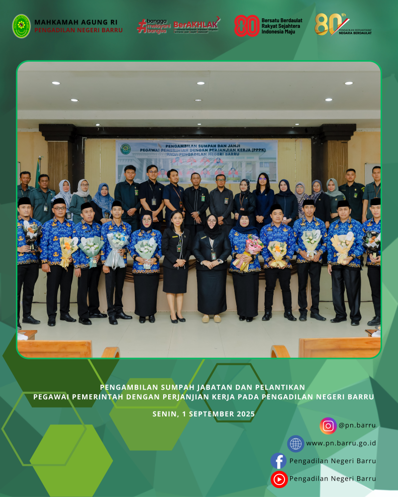 Pada hari Senin, tanggal 1 September 2025, bertempat di Aula K. H. Badaruddin Amin, Institut Teknologi Bisnis dan Administrasi (ITBA) Al Gazali Barru, Pengadilan Negeri Barru menyelenggarakan acara Pengambilan Sumpah Jabatan dan Pelantikan Pegawai Pemerintah dengan Perjanjian Kerja (PPPK) yang dihadiri oleh Ketua dan Wakil Ketua Pengadilan Negeri Barru, para Hakim, Panitera, Sekretaris, Pejabat Struktural dan Fungsional, Panitera Pengganti, para staf, serta kerabat keluarga dari para PPPK yang diambil sumpah jabatannya.