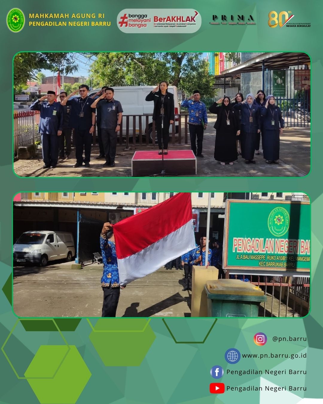 Pada hari Selasa, tanggal 28 Oktober 2025, bertempat di Halaman Kantor Pengadilan Negeri Barru, dilaksanakan Upacara Bendera Memperingati Hari Sumpah Pemuda ke-97 Tahun 2025. Upacara bendera berlangsung lancar dan khidmat yang diikuti segenap Aparatur Pengadilan Negeri Barru, baik dari Pimpinan, Para Hakim, Panitera, Sekretaris, Pejabat Fungsional dan Struktural, Staf, dan PPPK Pengadilan Negeri Barru.