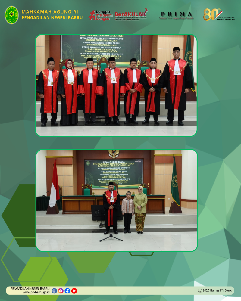 Pada hari Selasa, tanggal 4 November 2025, bertempat di Ruang Prof. Dr. H. M. Hatta Ali, S.H., M.H., Aula Lantai II, Pengadilan Tinggi Makassar, diadakan Sidang Luar Biasa Pengambilan Sumpah, Pelantikan, dan Serah Terima Jabatan Ketua Pengadilan Negeri Barru, Ricco Imam Vimayzar, S.H., M.H. bersama 3 (tiga) Ketua Pengadilan Negeri yang dilantik secara bersamaan, yakni Ketua Pengadilan Negeri Bantaeng, Ketua Pengadilan Negeri Sidrap, dan Ketua Pengadilan Negeri Jeneponto.