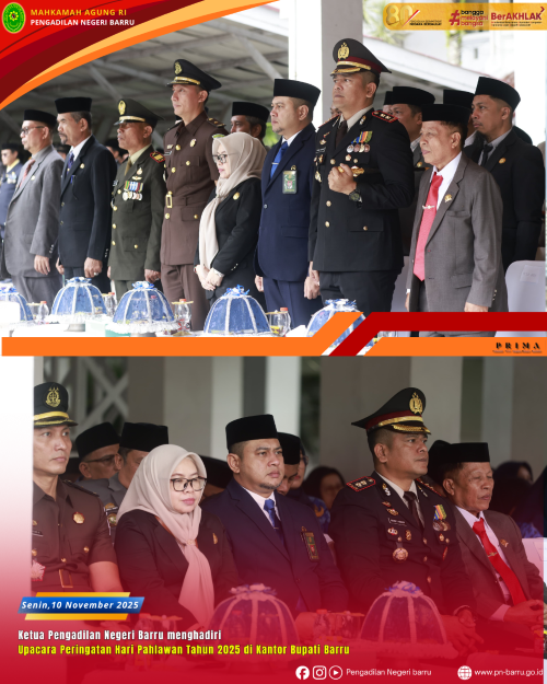 Pada hari Senin, tanggal 10 November 2025, bertempat di halaman Kantor Bupati Barru, dilaksanakan Upacara Peringatan Hari Pahlawan Tahun 2025 yang turut dihadiri langsung oleh Ketua Pengadilan Negeri Barru, Ricco Imam Vimayzar, S.H., M.H., bersama dengan unsur Forkopimda, tenaga kesehatan, organisasi profesi se-Kabupaten Barru, dan masyarakat Barru.