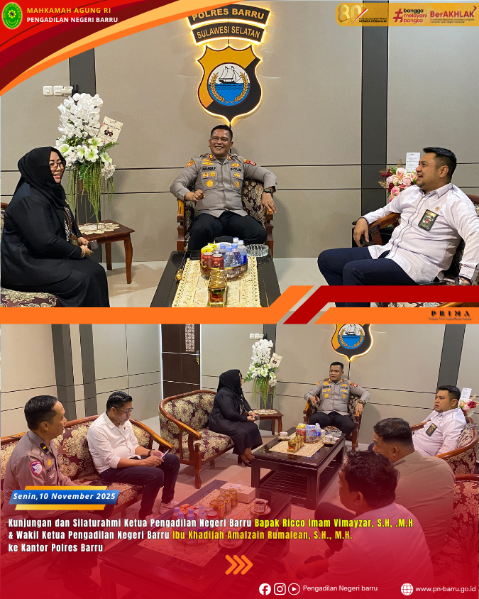 Pada hari Senin, tanggal 10 November 2025, dengan suasana penuh kehangatan dan keakraban, Kapolres Barru AKBP Ananda Fauzi Harahap, S.I.K., M.H. kedatangan tamu kehormatan dari Ketua Pengadilan Negeri Barru, Ricco Imam Vimayzar, S.H, M.H. dan Wakil Ketua Pengadilan Negeri Barru, Khadijah Amalzain Rumalean, S.H., M.H.