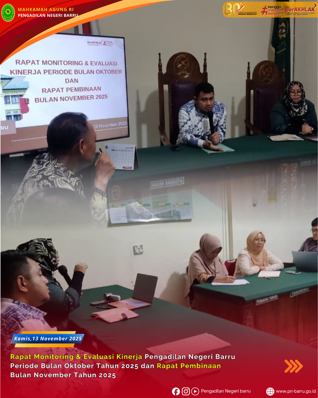 Pada hari Kamis, tanggal 13 November 2025, bertempat di Ruang Sidang Pengadilan Negeri Barru, Ketua dan Wakil Ketua Pengadilan Negeri Barru, para Hakim, Panitera, Sekretaris, Pejabat Struktural dan Fungsional, hingga seluruh staf dan PPPK Pengadilan Negeri Barru mengikuti agenda rutin yakni Rapat Monitoring dan Evaluasi Kinerja Periode Bulan Oktober 2025 dan Rapat Pembinaan Periode Bulan November 2025. Rapat dipimpin oleh Ketua Pengadilan Negeri Barru, Ricco Imam Vimayzar, S.H., M.H. didampingi oleh Wakil Ketua Pengadilan Negeri Barru, Khadijah Amalzain Rumalean, S.H., M.H.