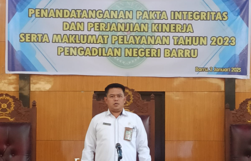 Pada hari Senin, tanggal 02 Januari 2023. bertempat di Ruang Rapat Pengadilan Negeri Barru, telah dilangsungkan Penandatanganan Pakta Integritas dan Perjanjian Kinerja serta Maklumat Pelayanan Tahun 2023 Pengadilan Negeri Barru. Kegiatan ini diikuti oleh seluruh Aparatur Pengadilan Negeri Barru. Seperti tahun-tahun sebelumnya, Penandatanganan Pakta Integritas dan Perjanjian Kinerja serta Maklumat Pelayanan ini adalah sebagai bentuk tanggung jawab, memberikan kinerja yang terbaik, saling berkoordinasi, dan komitmen untuk memberikan pelayanan yang terbaik.