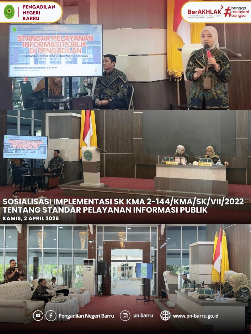 Pada hari Kamis, tanggal 2 April 2026, bertempat di Baruga Singkerru Ada'e Rumah Jabatan Bupati Barru, telah dilaksanakan kegiatan Sosialisasi Implementasi Surat Keputusan Ketua Mahkamah Agung Republik Indonesia Nomor 2-144/KMA/SK/VII/2022 tentang Standar Pelayanan Informasi Publik. Sosialisasi ini dihadiri Ketua Pengadilan Negeri Barru, Ricco Imam Vimayzar, S.H., M.H., Wakil Ketua Pengadilan Negeri Barru, Khadijah Amalzain Rumalean, S.H., M.H., unsur Aparat Penegak Hukum di Kabupaten Barru, di antaranya Kejaksaan Negeri Barru, Rumah Tahanan Negara (Rutan) Barru, Kepolisian Resor (Polres) Barru, Yayasan Rumah Hukum Lasinrang Kabupaten Barru, tamu undangan kehormatan lainnya, serta keluarga besar Pengadilan Negeri Barru.