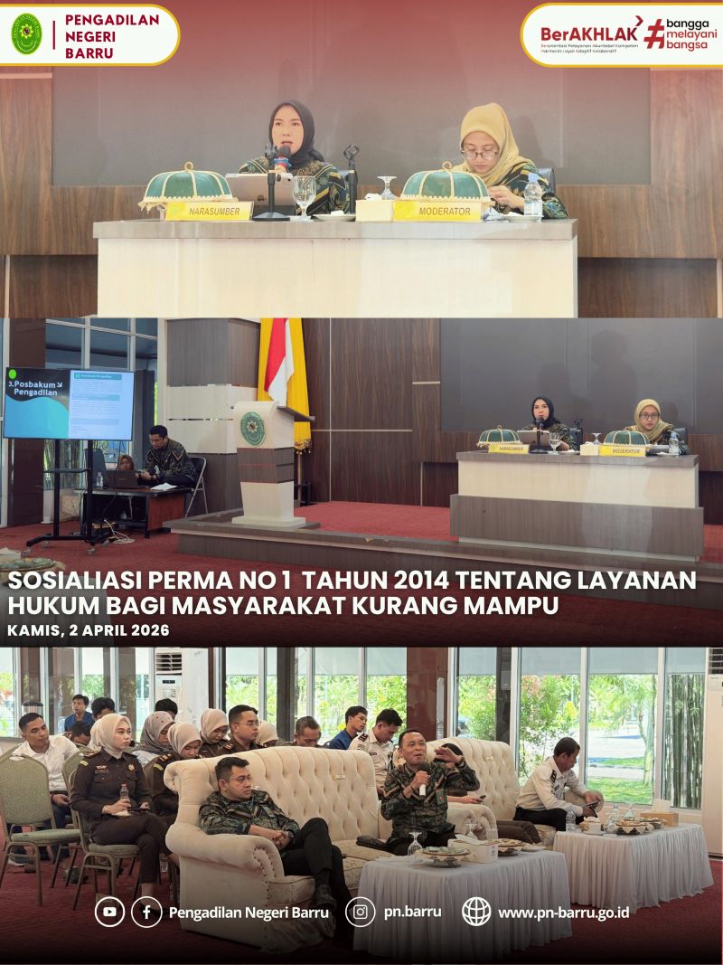 Pada hari Kamis, tanggal 2 April 2026, bertempat di Baruga Singkerru Ada'e Rumah Jabatan Bupati Barru, telah dilaksanakan kegiatan Sosialisasi Peraturan Mahkamah Agung Republik Indonesia Nomor 1 Tahun 2014 tentang Layanan Hukum bagi Masyarakat Kurang Mampu. Sosialisasi ini dihadiri Ketua Pengadilan Negeri Barru, Ricco Imam Vimayzar, S.H., M.H., Wakil Ketua Pengadilan Negeri Barru, Khadijah Amalzain Rumalean, S.H., M.H., unsur Aparat Penegak Hukum di Kabupaten Barru, di antaranya Kejaksaan Negeri Barru, Rumah Tahanan Negara (Rutan) Barru, Kepolisian Resor (Polres) Barru, Yayasan Rumah Hukum Lasinrang Kabupaten Barru, tamu undangan kehormatan lainnya, serta keluarga besar Pengadilan Negeri Barru.