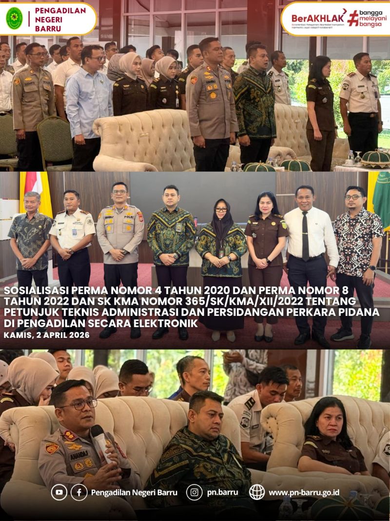 Pada hari Kamis, tanggal 2 April 2026, bertempat di Baruga Singkerru Ada'e Rumah Jabatan Bupati Barru, telah dilaksanakan kegiatan Sosialisasi Peraturan Mahkamah Agung Republik Indonesia Nomor 4 Tahun 2020, Peraturan Mahkamah Agung Republik Indonesia Nomor 8 Tahun 2022, serta Surat Keputusan Ketua Mahkamah Agung Republik Indonesia Nomor 365/SK/KMA/XII/2022 tentang Petunjuk Teknis Administrasi dan Persidangan Perkara Pidana di Pengadilan Secara Elektronik. Sosialisasi ini dihadiri Ketua Pengadilan Negeri Barru, Ricco Imam Vimayzar, S.H., M.H., Wakil Ketua Pengadilan Negeri Barru, Khadijah Amalzain Rumalean, S.H., M.H., unsur Aparat Penegak Hukum di Kabupaten Barru, di antaranya Kejaksaan Negeri Barru, Rumah Tahanan Negara (Rutan) Barru, Kepolisian Resor (Polres) Barru, Yayasan Rumah Hukum Lasinrang Kabupaten Barru, tamu undangan kehormatan lainnya, serta keluarga besar Pengadilan Negeri Barru.