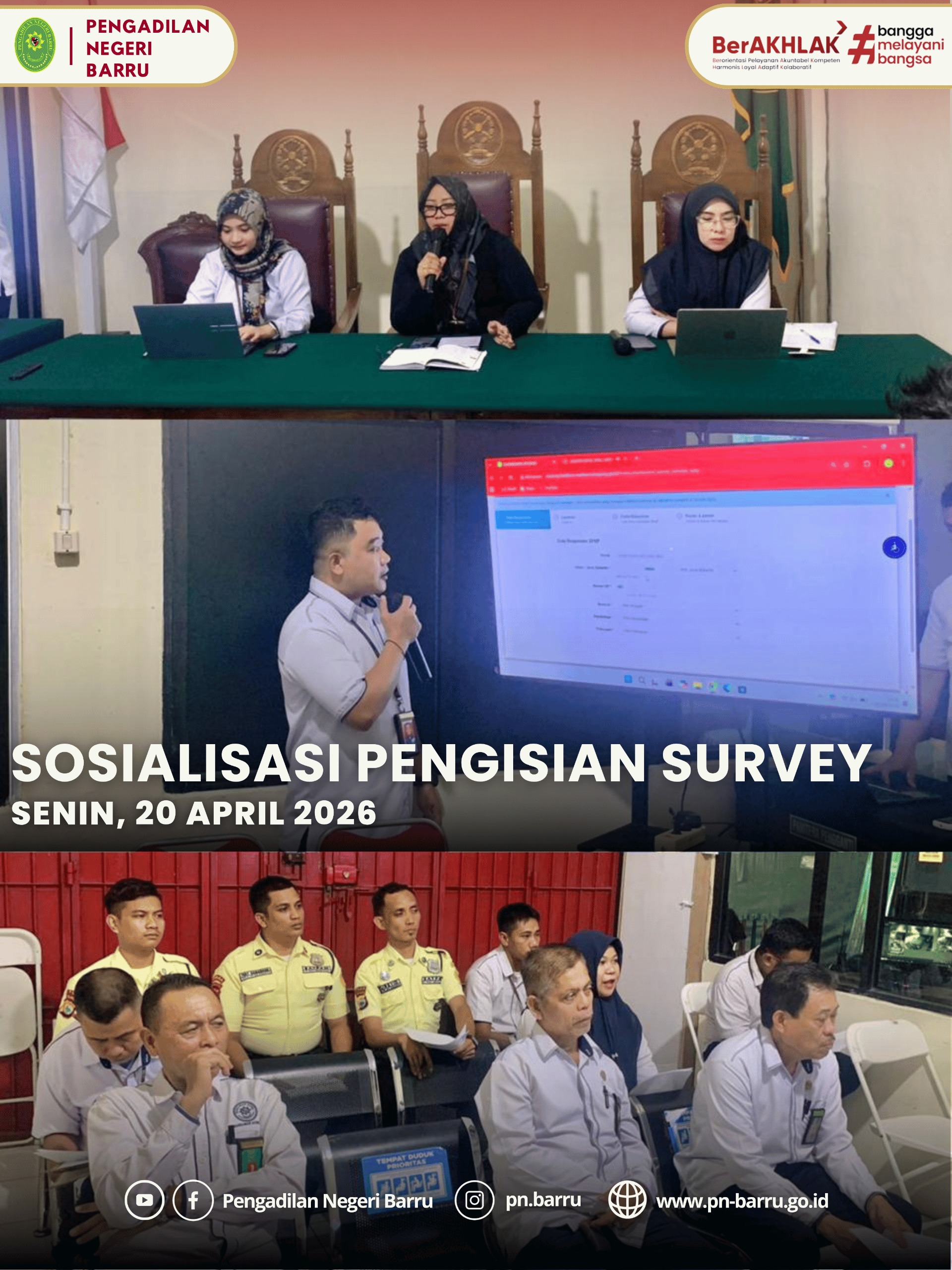 Pada Senin, 20 April 2026, bertempat di Ruang Sidang Cakra Pengadilan Negeri Barru, telah diselenggarakan kegiatan sosialisasi mengenai pengisian survei SPAK (Survei Persepsi Anti Korupsi), SPKP (Survei Persepsi Kualitas Pelayanan), SKM (Survei Kepuasan Masyarakat), serta Survei Harian. Kegiatan ini dipimpin oleh Wakil Ketua Pengadilan Negeri Barru, Khadijah Amalzain Rumalean, S.H., M.H., dan dihadiri oleh Ketua Tim Survei, Hakim Pengawas PTSP, Panitera, Sekretaris, para Panitera Muda, Kepala Sub Bagian, serta seluruh petugas layanan front office atau PTSP.